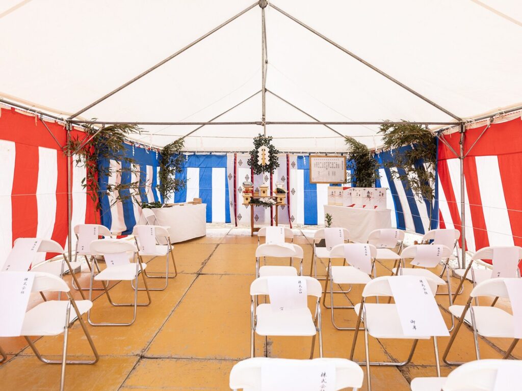 建築工事の安全と無事を祈るための地鎮祭を行います。土地の神様に工事の安全をお願いし、工事の開始を見守ります。